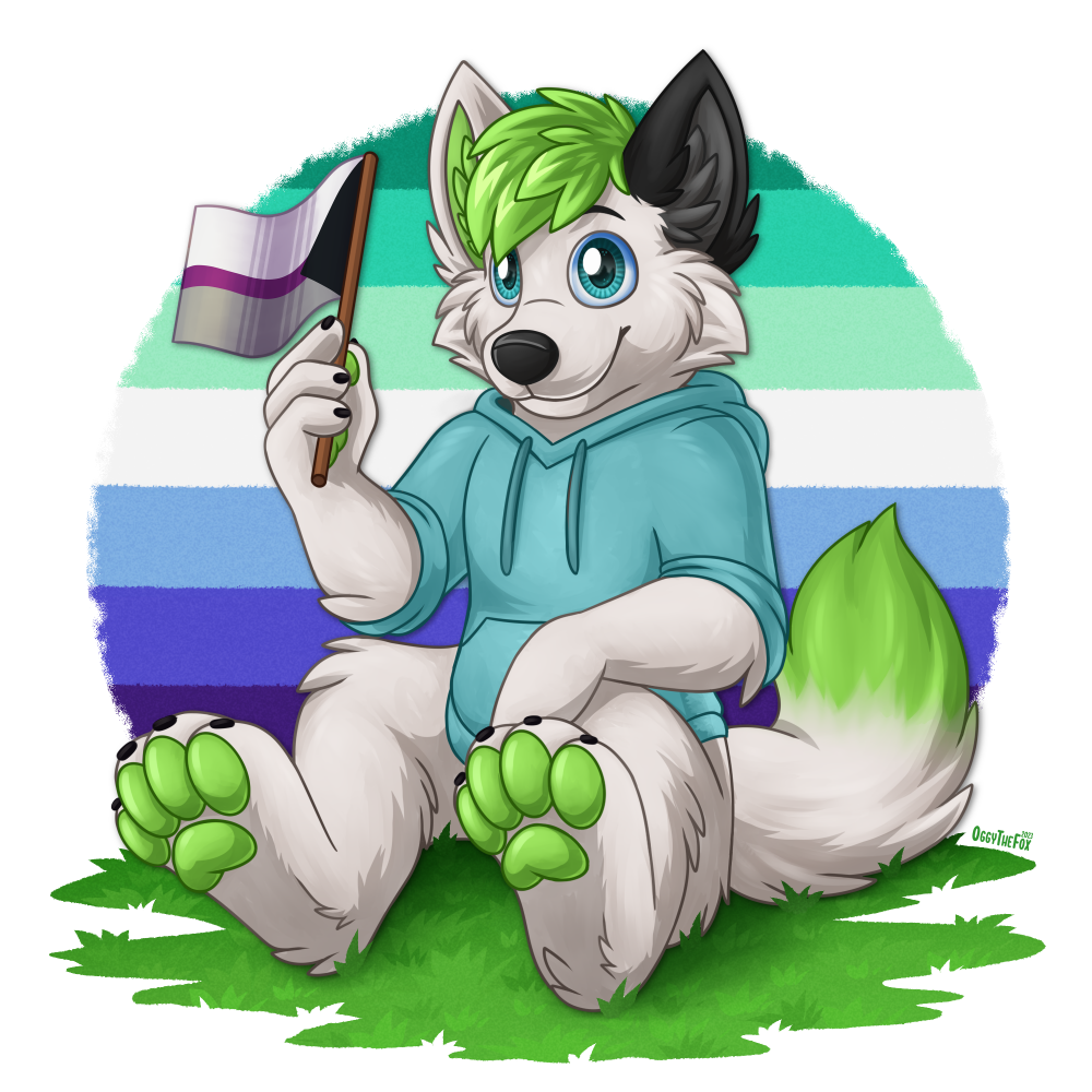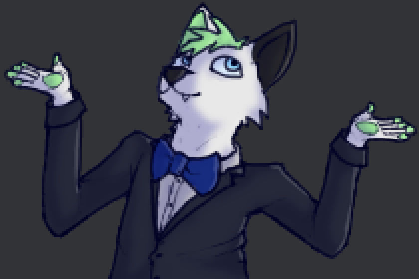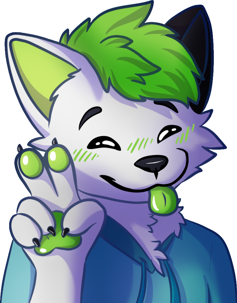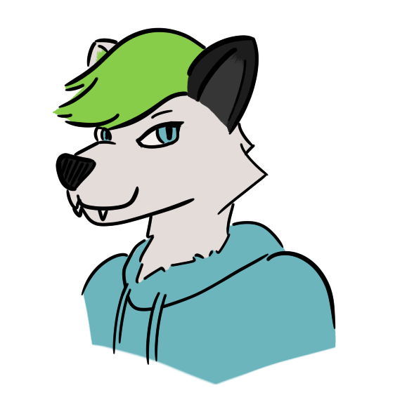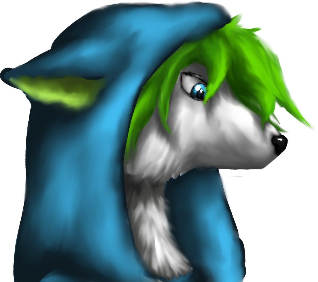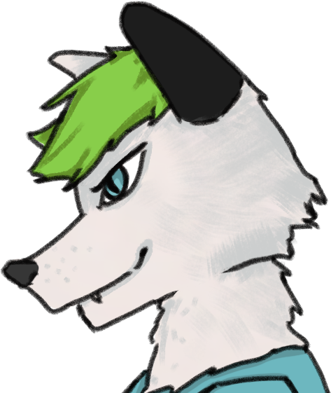 Finn is around 170 cm or 5'7'' tall, which makes him a bit smaller than some of his friends. His tail is very wide and around half as big as him. It features a green tip. His right ear is white with a green inner portion, while his left ear is completely black. It is rumoured that this symbolises a dark past, but no one is actually sure. A green patch of hair covers his head, perfect to pat or to ruffle through. His blue eyes exude absolute trust to those he loves. His paws show green beans.