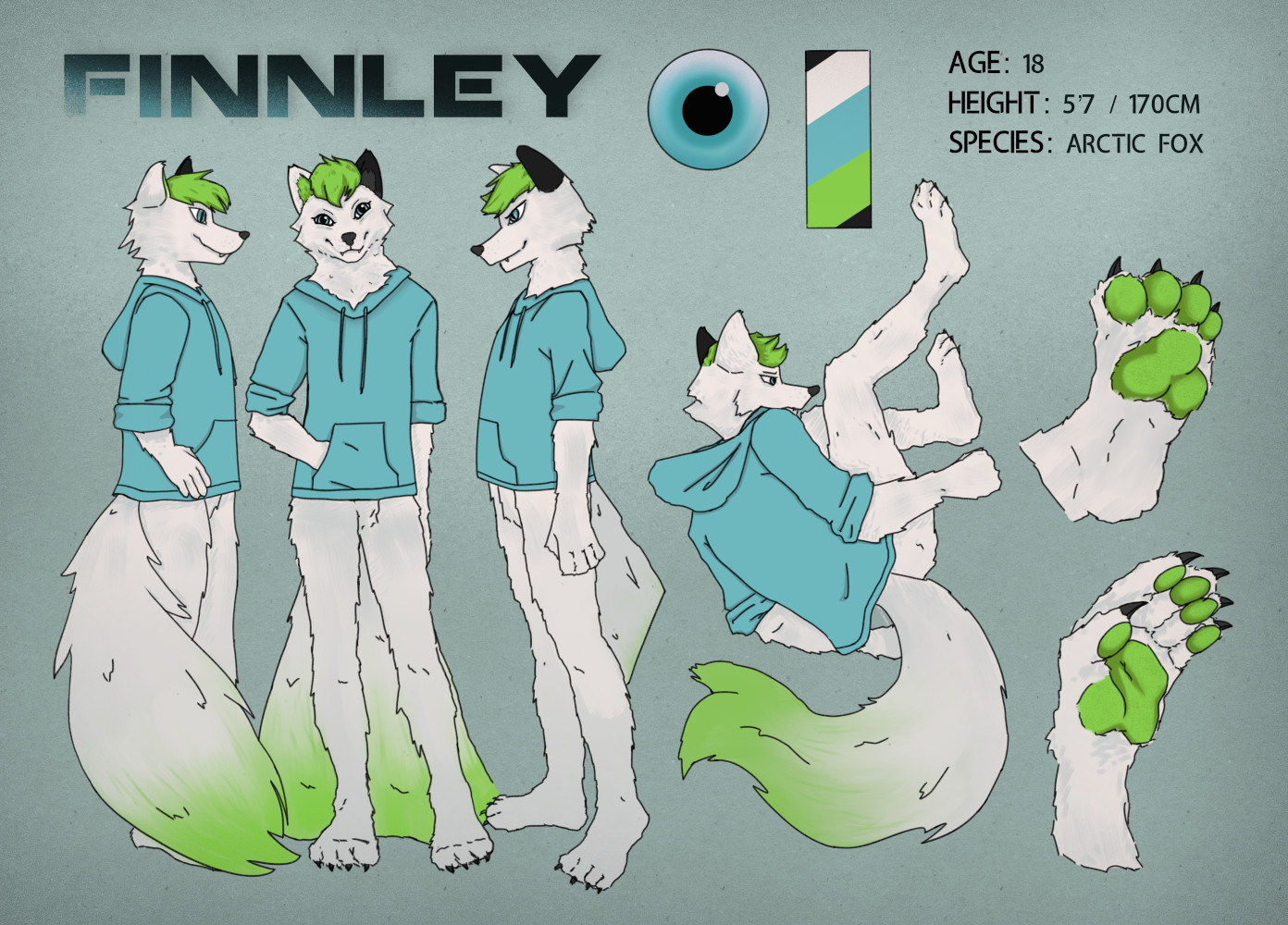 Finnley Wittevos (often just Finnley or Finn) is a mostly standard arctic fox with some colorful touches across his body.